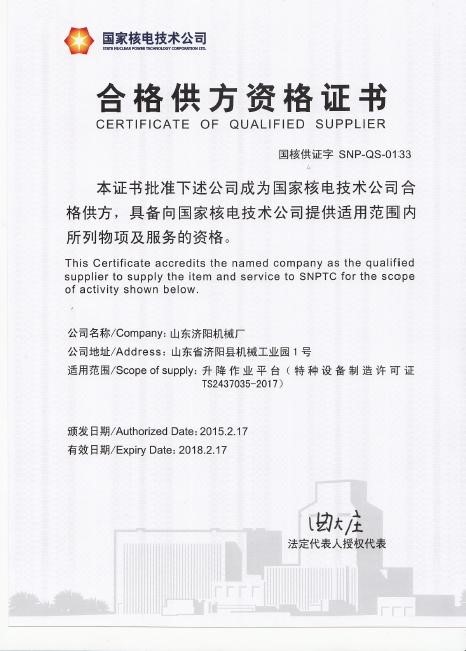 繼2010年我公司憑借強(qiáng)大實(shí)力成功擊敗多家國(guó)內(nèi)外知名公司,中標(biāo)國(guó)家核電總公司AP1000浙江三門核電站,山東海陽(yáng)核電站液壓升降機(jī)項(xiàng)目之后,2015年經(jīng)過精心準(zhǔn)備,我公司又成功中標(biāo)國(guó)家核電工程公司壓水堆示范工程項(xiàng)目CAP1400 1號(hào)、2號(hào)機(jī)組液壓升降平臺(tái)項(xiàng)目。
